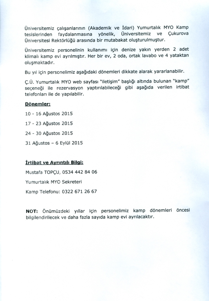 Üniversitemiz Personeli Oluşturulan Mutabakat Kapsamında ÇÜ Yumurtalık MYO Tesislerinden Yararlanabilecek