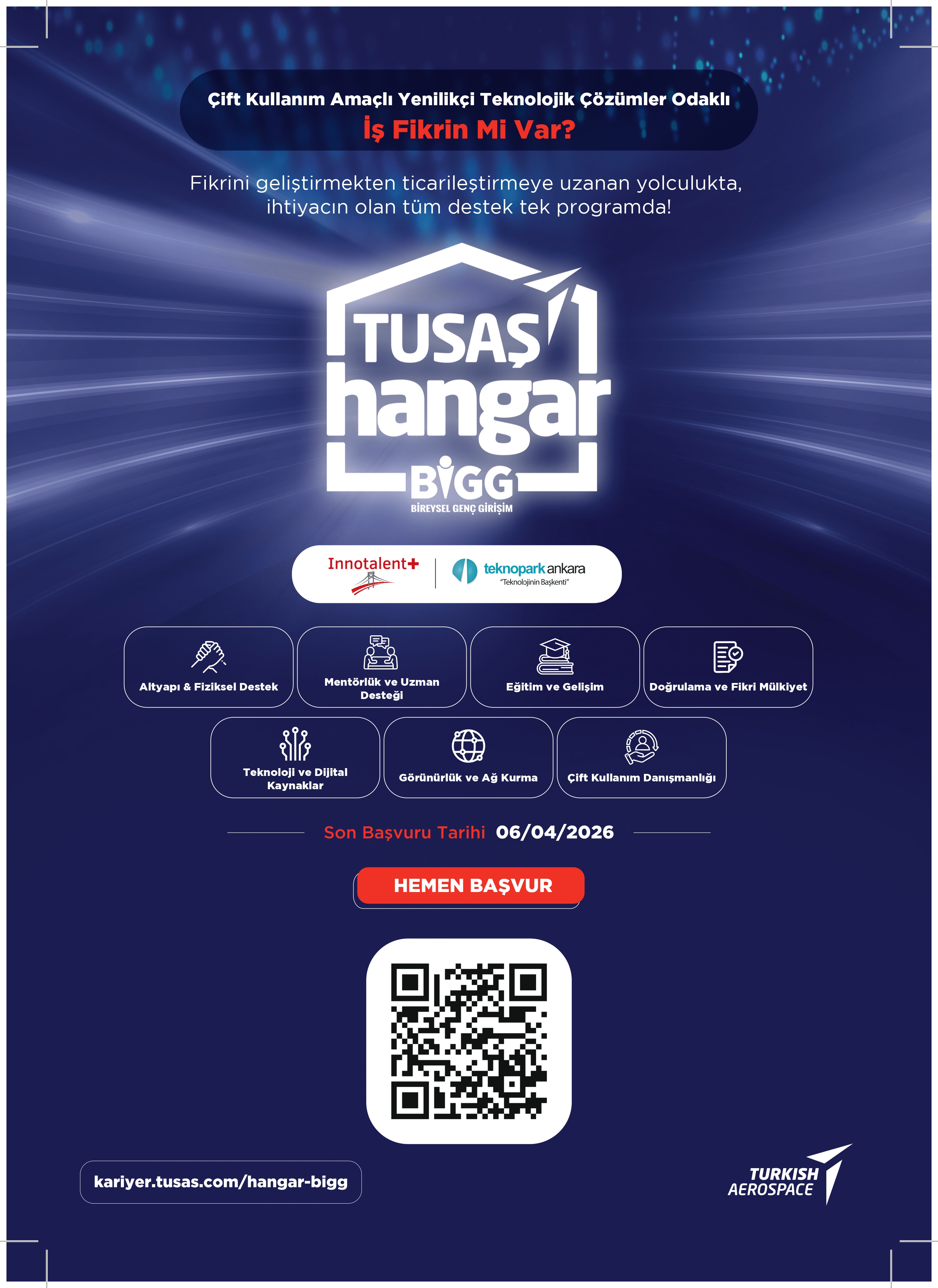 Son başvuru tarihi 06.04.2026 olan HANGAR BİGG programı; Çift Kullanım (Dual Use) Amaçlı Yenilikçi Teknolojik Çözümler odak alanındaki iş fikirlerini değerlendirmeye alacaktır.