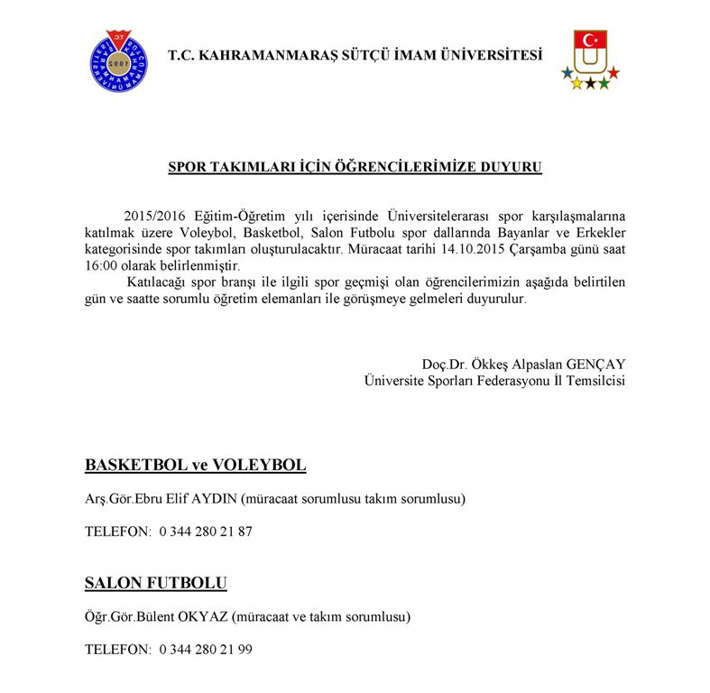 Üniversitemiz Spor Takımlarına Katılmak İsteyen Öğrencilerin Dikkatine