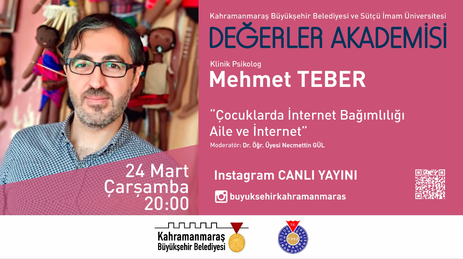 Kahramanmaraş Sütçü İmam Üniversitesi İİBF Sosyal Hizmet Bölümü ve Kahramanmaraş Büyükşehir Belediyesi Sağlık ve Sosyal Hizmetler Daire Başkanlığı Kadın ve Aile Şube Müdürlüğü ortaklığında ailenin güçlendirilmesi, ailede sorunların azaltılması ve kadına yönelik şiddet konusunda farkındalık oluşturmak amacıyla aileyi ilgilendiren önemli başlıklarda sosyal medya üzerinden "Değerler Akademisi Seminerleri" düzenlenecektir.