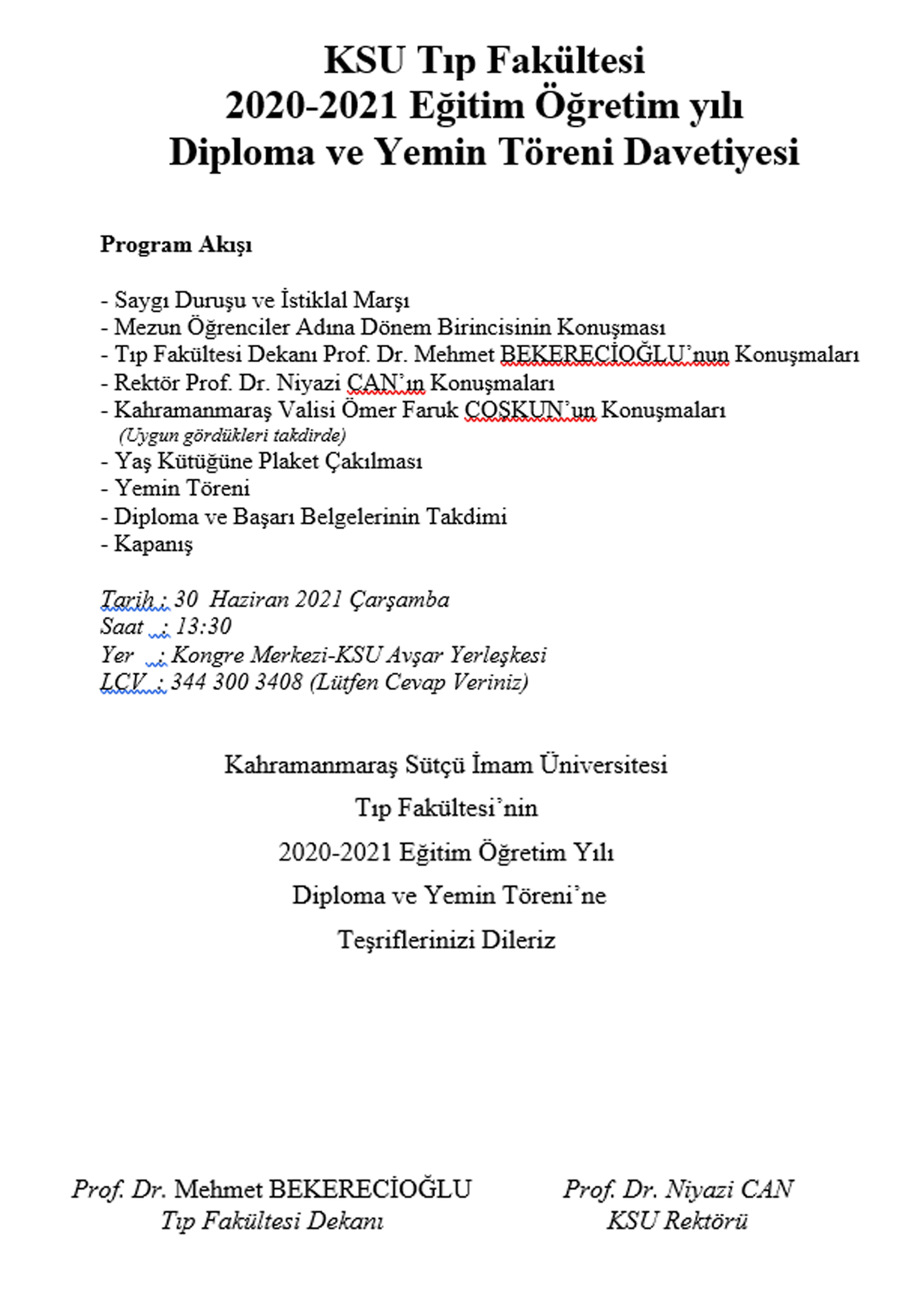KSU Tıp Fakültesi 2020-2021 Eğitim Öğretim yılı Diploma ve Yemin Töreni