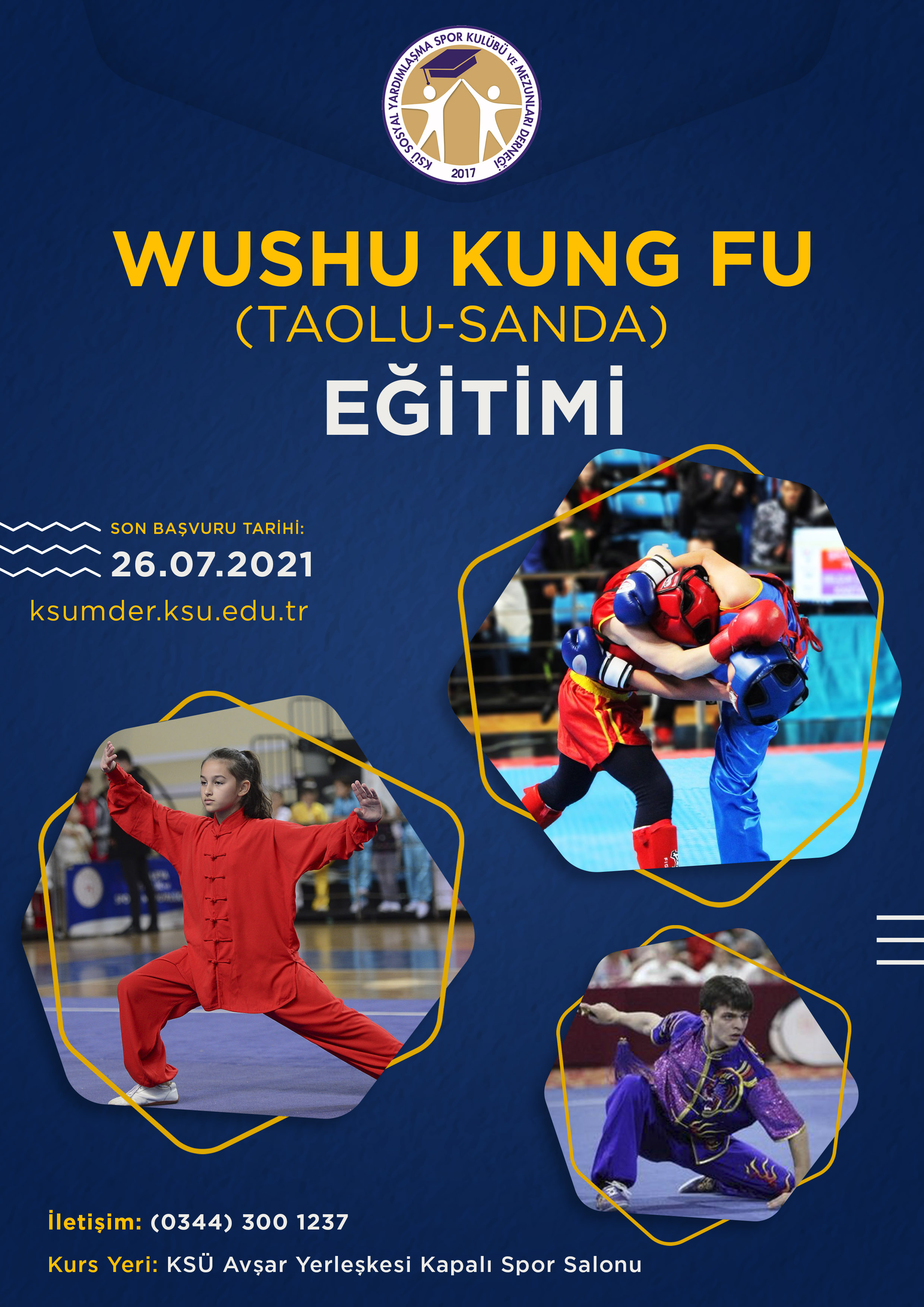 KSÜ Sosyal Yardımlaşma Spor Kulübü ve Mezunları Derneği tarafından KSÜ Spor Kulübü Antrenörü Ahmet GÖZÜKARA yönetiminde Wushu Kung Fu (Taolu-Sanda) eğitimi verilecektir.