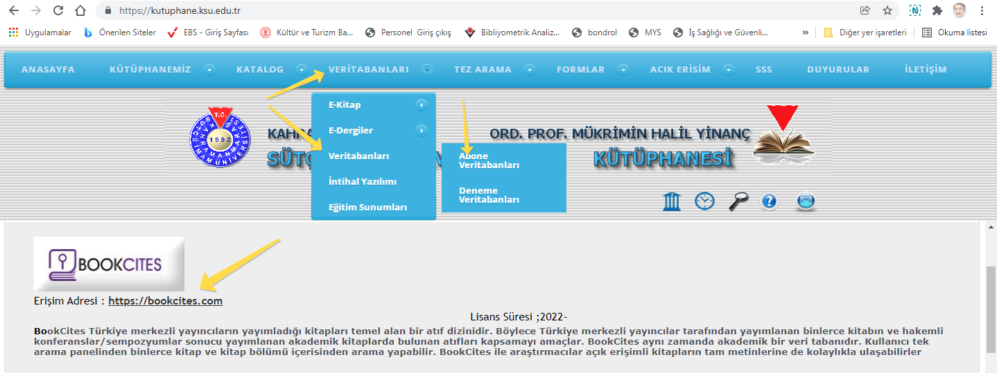 2022 Yılı Üniversitemizin abone olduğu veritabanlarına Book Cites Kitap Atıf Veritabanı olarak eklenmiştir. 07.01.2022 itibariyle kullanıma açılmıştır. Kütüphanemiz web sayfası veritabanları kısmında yerini almıştır.