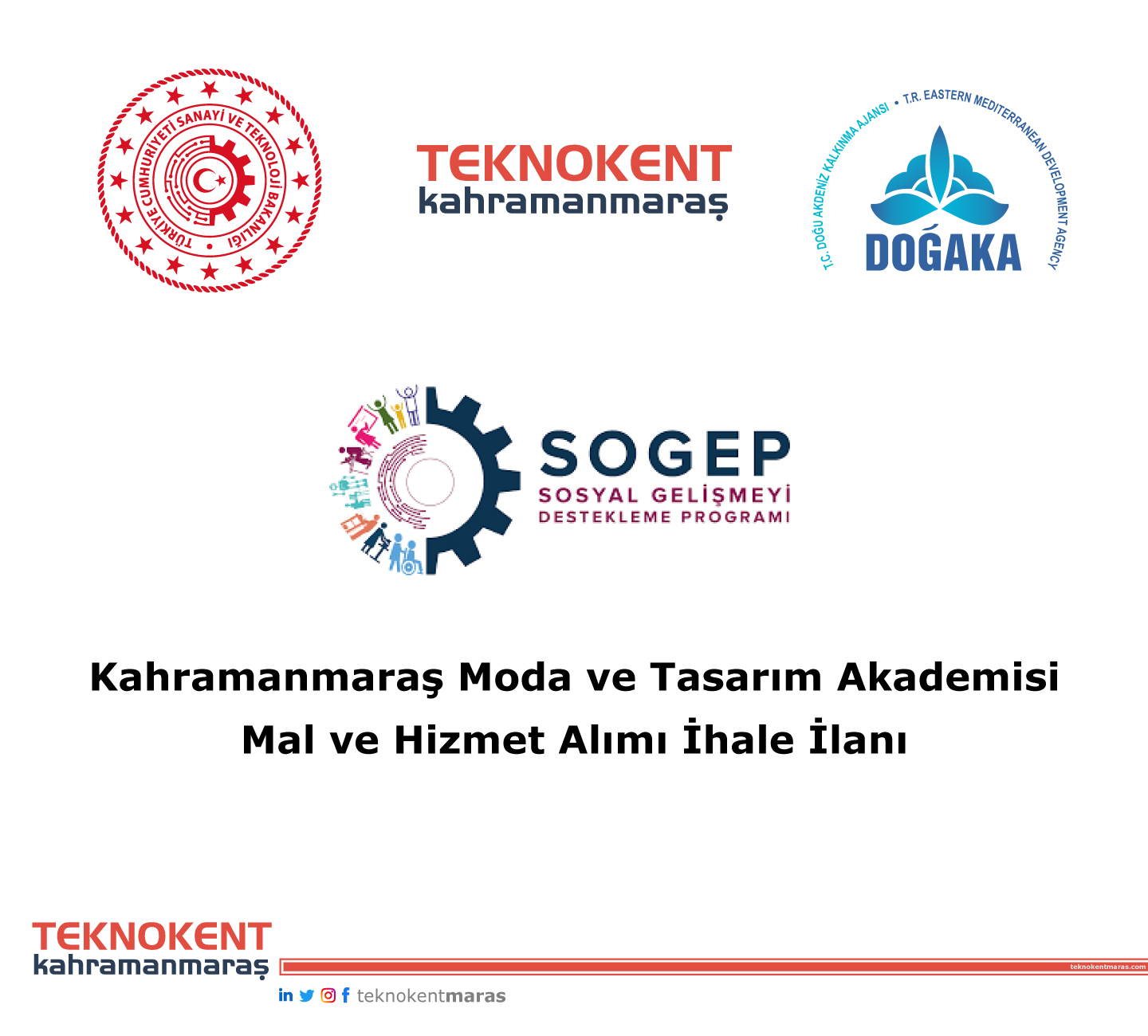 Kahramanmaraş Teknokent Yönetici A.Ş. Doğu Akdeniz Kalkınma Ajansı Sosyal Gelişmeyi Destekleme Programı kapsamında sağlanan mali destek ile “Kahramanmaraş Moda ve Tasarım Akademisi” kuruluşu için bir mal ve hizmet alımı ihalesi sonuçlandırmayı planlamaktadır.