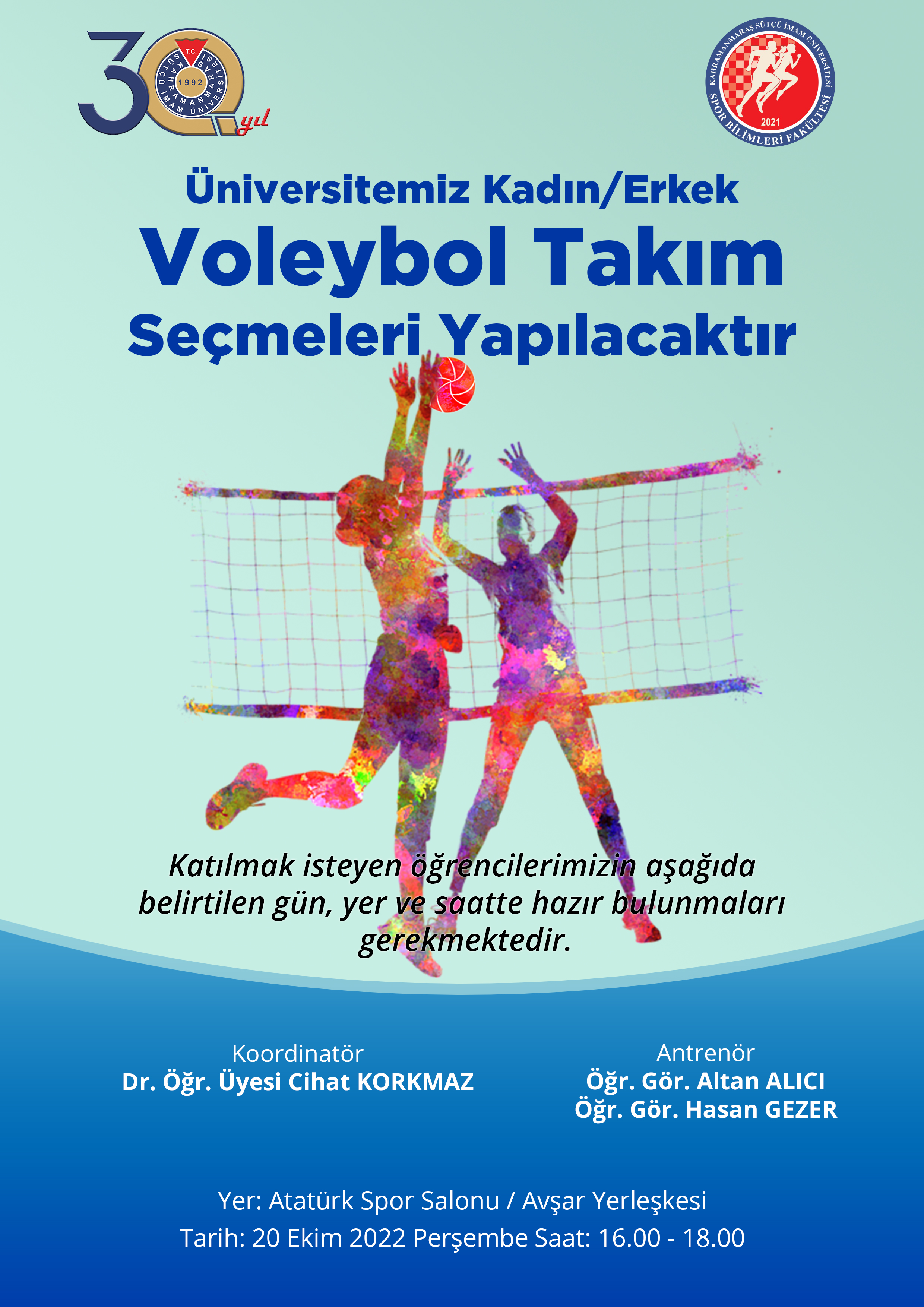 Üniversitemiz Kadın/Erkek Voleybol Takım Seçmeleri Yapılacaktır