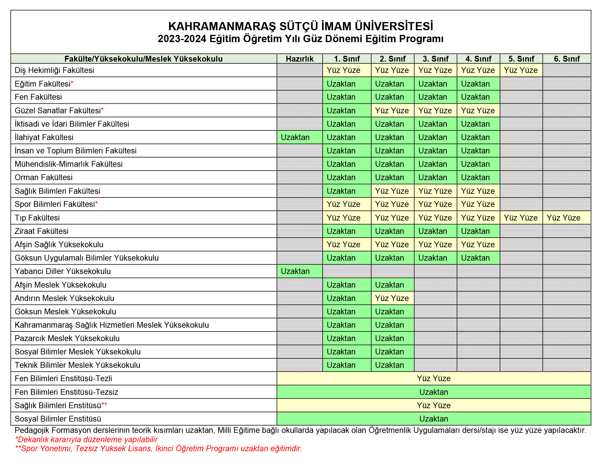 Ancak; güncel durum itibarıyla şehrimizde öğrencilerin barınma sorunlarının çözülemediği, öğrenci yurtlarının bağlı olduğu Gençlik ve Spor İl Müdürlüğü yetkilileri ile yapılan görüşmelerde mevcut yurt binalarının tamiratının tamamlanamadığı, kapasite artırma işlemlerinin gerçekleştirilemediği gibi tamirat dolayısıyla mevcut kapasitenin de ancak yarısının kullanılabildiği, bu sorunun bir süre daha devam edeceğinin ve çözümü için süreye ihtiyaç bulunduğunun bildirilmesi sebebiyle Üniversitemizde 2023-2024 Akademik Yılı Güz Yarıyılında eğitim-öğretim faaliyetlerinin aşağıdaki tabloda belirtilen şekilde uygulanmasının uygun olduğuna karar verilmiştir.