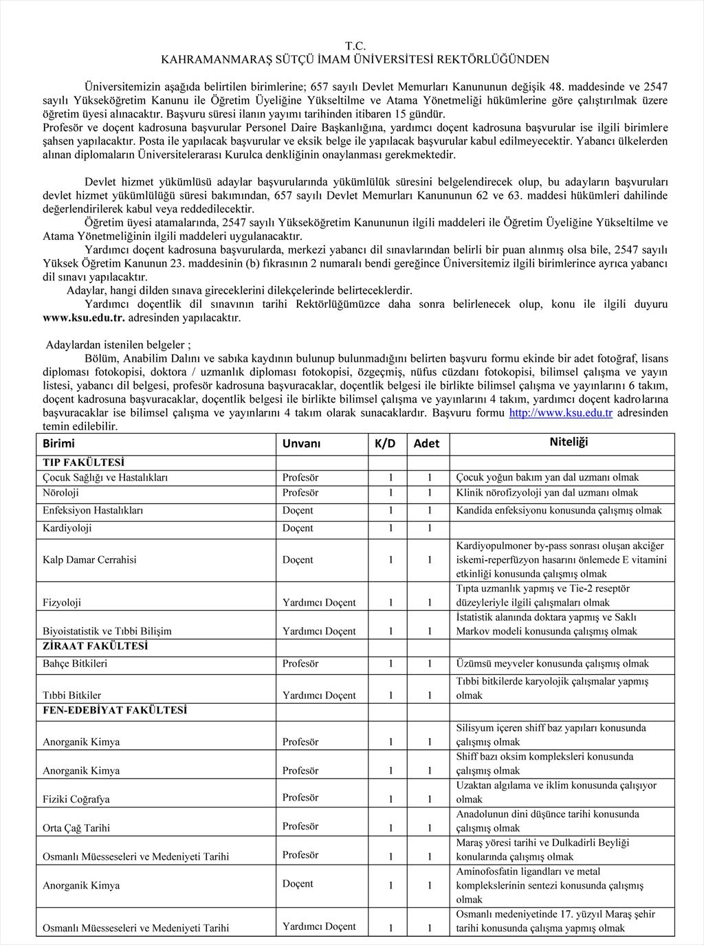 Profesör, Doçent ve Yardımcı Doçent Alım İlanı